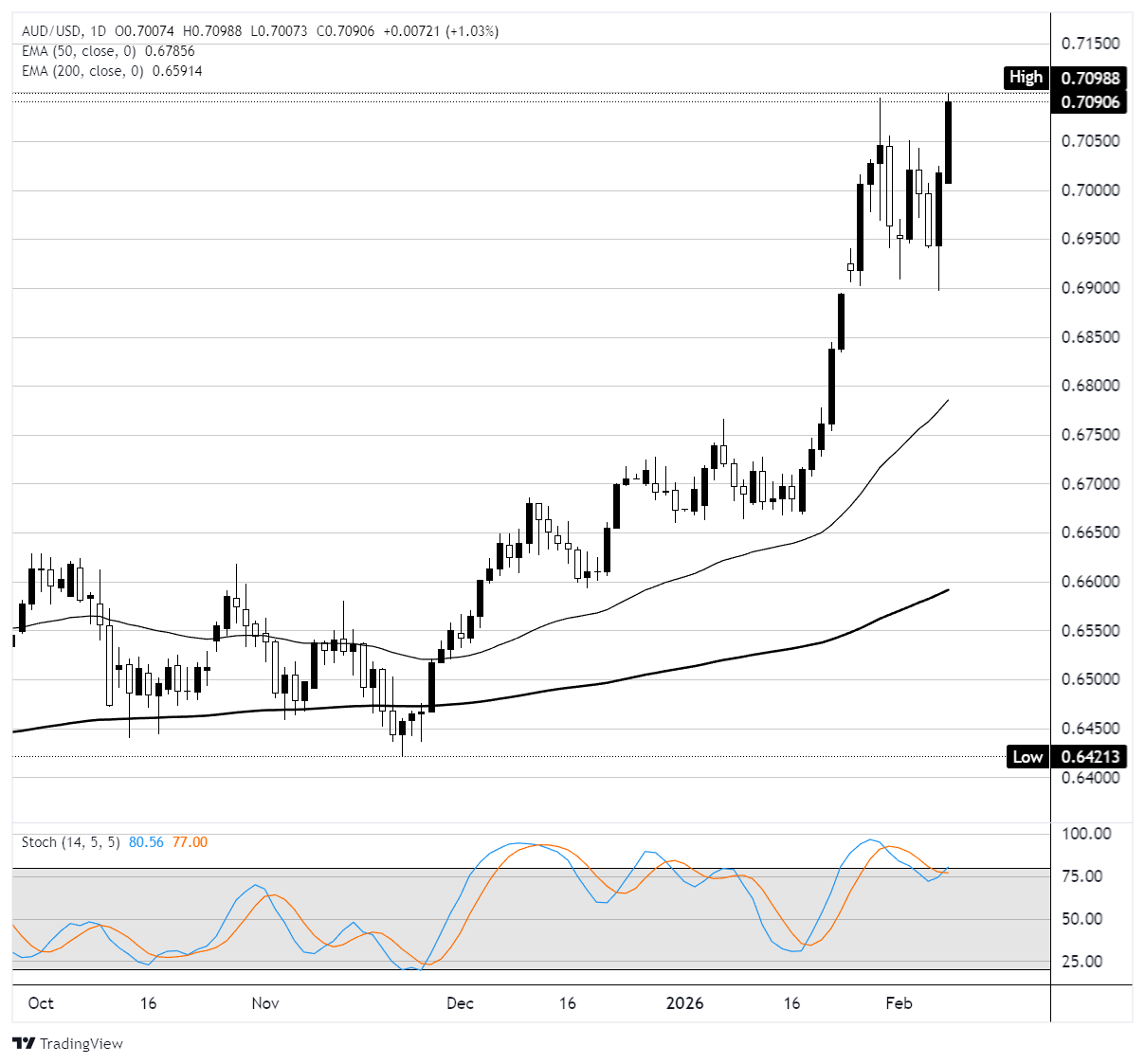 AUD/USD diperdagangkan dekat level tertinggi tiga tahun setelah terobosan kuat di atas level psikologis 0,7000 untuk pertama kalinya sejak Februari 2023, didukung oleh kenaikan suku bunga kejutan 25 basis poin RBA menjadi 3,85% pada pertemuan Februari. Grafik harian menunjukkan pasangan ini dalam tren naik yang terdefinisi dengan baik, bertahan di atas baik Exponential Moving Average (EMA) 50-hari di dekat 0,6970 dan EMA 200-hari di sekitar 0,6700. Harga mencapai tertinggi 0,7094 pada 29 Januari sebelum mundur ke area 0,6960 akhir pekan lalu saat aliran risiko menurun dan aksi jual ekuitas yang dipimpin teknologi menekan Dolar Australia yang terkait dengan komoditas. Sesi hari Senin melihat pembeli kembali masuk, mendorong AUD/USD naik sekitar 1% untuk diperdagangkan di sekitar 0,7070 hingga 0,7085 di tengah lemahnya Dolar AS, saat narasi pemotongan suku bunga Federal Reserve (Fed) mendapatkan momentum dengan pasar memprakirakan dua pemotongan lagi pada 2026. Struktur yang lebih luas mendukung pembeli selama pasangan ini bertahan di atas angka bulat 0,7000 pada basis penutupan harian.