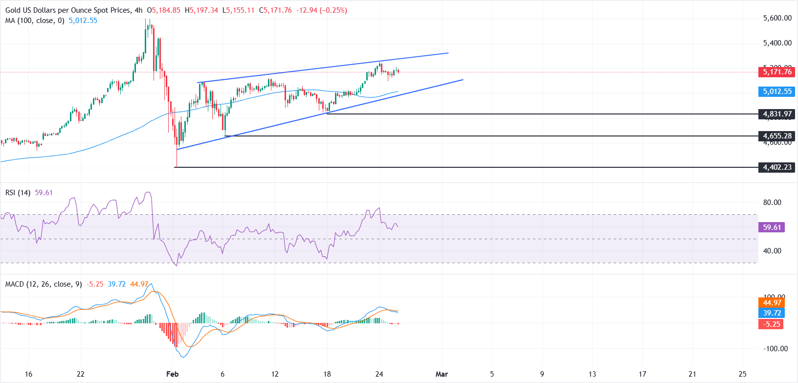 • Dari segi teknis, XAU/USD diperdagangkan dalam pola rising wedge pada grafik 4 jam, dengan $5.250 berfungsi sebagai resistance utama.