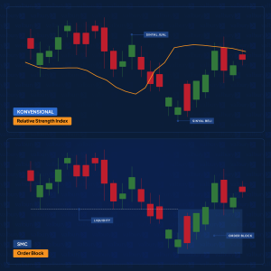 Perbedaan utama antara SMC dan analisis teknikal konvensional terletak pada kedalaman perspektif dan pendekatan terhadap pergerakan harga. SMC memusatkan perhatian pada psikologi pasar dan niat tersembunyi dari pelaku institusional besar, seperti bagaimana mereka mengatur likuiditas, mengelola risiko, serta menyusun strategi distribusi dan akumulasi. Di sisi lain, analisis teknikal konvensional umumnya mengandalkan indikator seperti RSI, MACD, dan moving average yang bersifat lagging, yaitu merespons setelah pergerakan harga terjadi. Hal ini membuatnya cenderung reaktif dan kurang mampu mengantisipasi perubahan besar. SMC justru menekankan analisis proaktif, dengan membaca pola perilaku harga yang mencerminkan aktivitas institusi, seperti order block, liquidity sweep, dan fair value gap. Dengan demikian, pendekatan SMC memberikan trader keunggulan dalam membaca niat pasar sebelum pergerakan signifikan dimulai, bukan sekadar merespons setelah tren terbentuk.