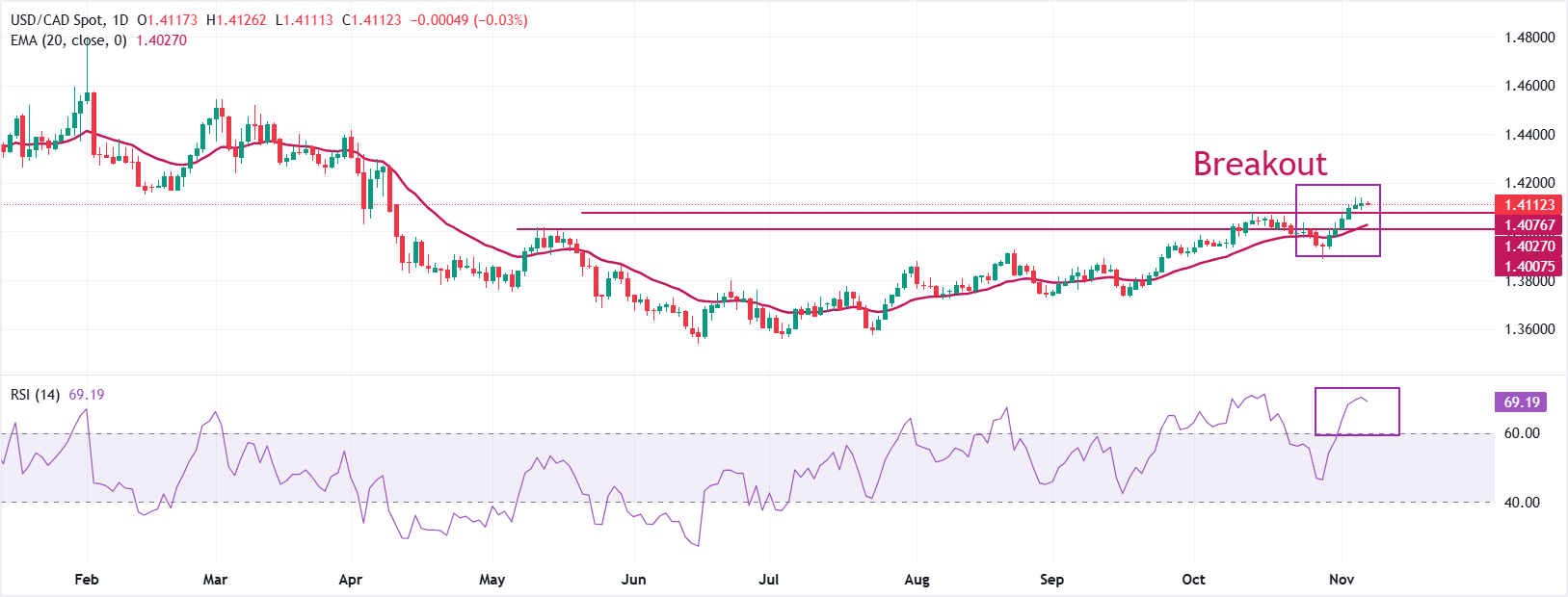 Exponential Moving Average (EMA) 20 hari yang miring ke atas di dekat 1,4027 menunjukkan bahwa tren jangka pendek bersifat bullish.