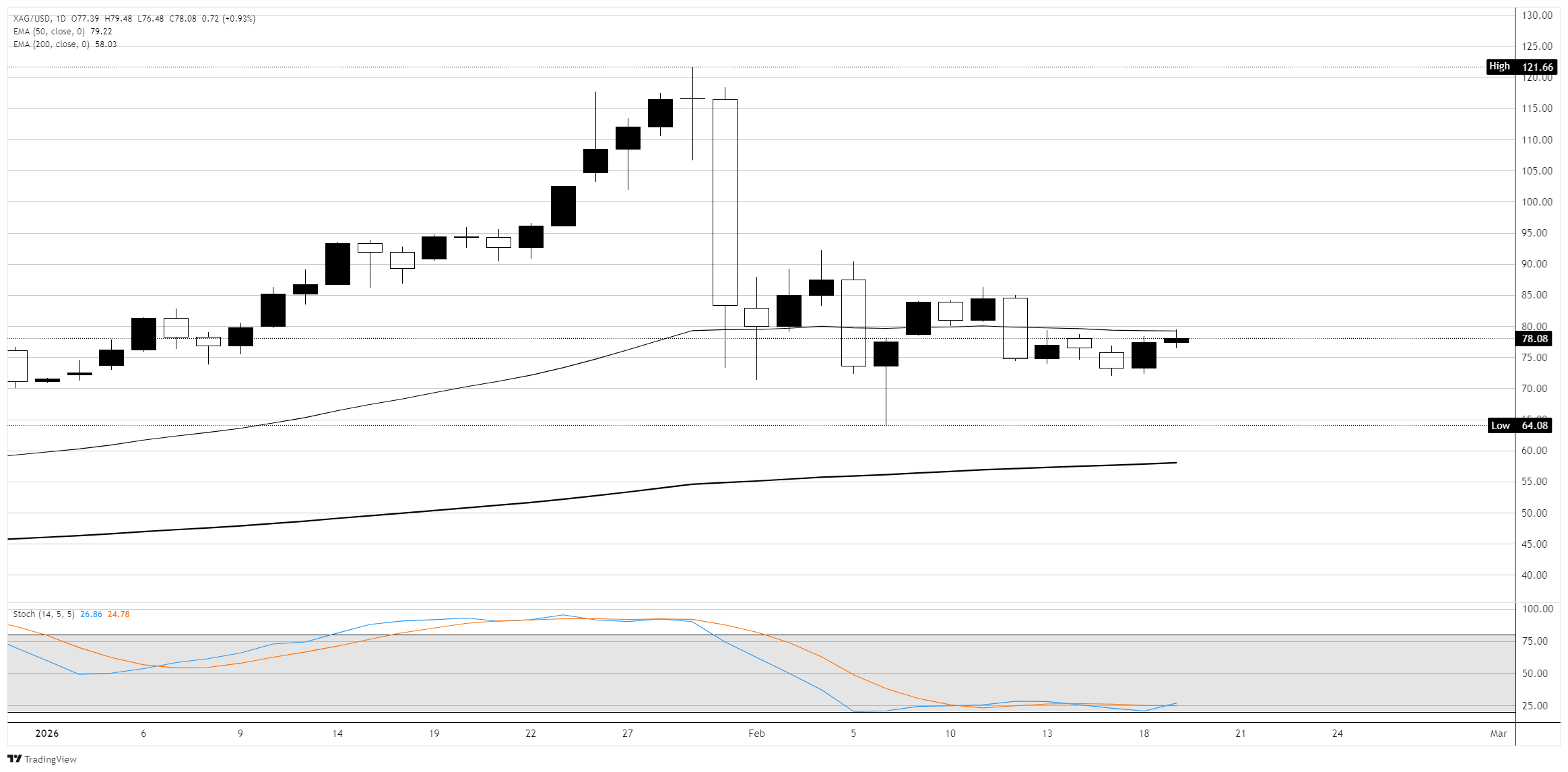 Harga Spot Perak diperdagangkan sedikit di bawah Exponential Moving Average (EMA) 50-hari yang mendatar di 79,22, yang berfungsi sebagai resistance jangka pendek, sementara EMA 200-hari di 58,03 berada jauh di bawah, mengonfirmasi bahwa tren naik yang lebih luas tetap ada, meskipun mulai melemah. Pemulihan dari level terendah 6 Februari di 64,08 telah berombak, dengan Perak merebut kembali sekitar setengah dari kerugian dari lonjakan akhir Januari sebelum terhenti dalam rentang lilin kecil dan doji di sekitar zona 75 hingga 85 selama dua minggu terakhir.